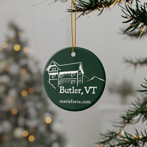 Bring the Butler, VT Series to your holiday celebration with this ceramic ornament, which offers a touch of elegance with its 100% ceramic construction and glossy finish. Each ornament comes with a gold string for easy hanging, making it a charming addition to any festive setting.